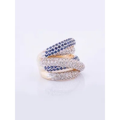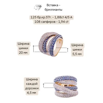 Women's yellow gold ring585samples with natural diamonds and sapphires.Product Feature:weight13G, 125round natural diamonds- 1.88 ct 4/5A, 108sapphires- 1.94 ct.Weights and specifications are average valuesand may differ slightly from actual ones.. Our jewelry undergoes testing and hallmarking procedures by the Russian State Assay Office. Each product is assigned a UIN(unique identification number), which is applied to the label of marked jewelry. Using it you can get reliable information about the jewelry on the official website of the Russian State Assay Chamber. Diamonds undergo an independent gemological examination in the Moscow State University laboratory. The decoration comes complete with branded packaging: jewelry case, branded package and a small compliment. We have been working for you since 2007.
