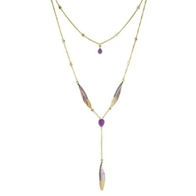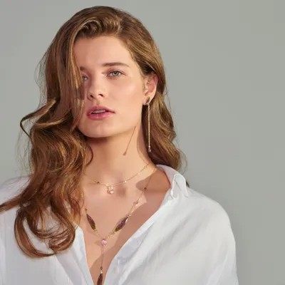 The main symbol of the collection Libelle —dragonfly and its wings,as a reflection of eternal femininity,love,happiness and beauty,as well as the unique style of Art Nouveau.Bright colors of stained glass enamel,brilliant shine of natural gemstones,flawless cut ,shine of gold—all this came together in decoration,to please and delight everyone at first sight.The necklace looks perfect on warm, soft skin.It emphasizes the line of the neck and shoulders,softly shimmers on the collarbones.Drops of stones fall into the fragile recess of the throat and flow down into the neckline,drawing attention to its beauty.Weightless gold chains are durable,graceful and weightless,so the necklace can be safely worn so often,as you wish.Don't deny yourself the pleasure of being irresistible,his future owner!