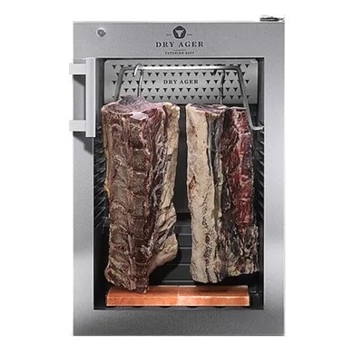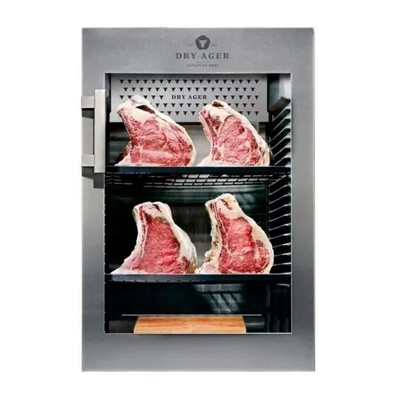 Closet DRY AGER DX0500PSdesigned for dry aging beef,as well as the production of meat snacks and sausages in food industry enterprises,catering and trade.The model is equipped with an electronic temperature and humidity controller,folding bottom,integrated slats and height-adjustable legs.Door frame made of stainless steel,frame-of steel,powder coated,door-glass with UV-filter..Peculiarities:DX AIRREG:optimal air flow,allowing you to maintain the desired microclimate inside,activated carbon filter and air sterilization system inside the cabinet Automatic defrosting Preset programs for aging meat Minor weight loss:from7before8%after4weeks of aging Reversible door LED lighting built into the side wallsDX LED Premiumadditional characteristics:Maximum load:2 carcasses lengthbefore0,5m20kg on shelves Volume:General: 147lUseful: 132lCase finish:satin black