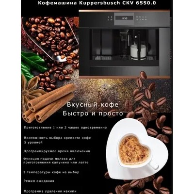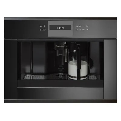 Coffee machine Kuppersbusch CKV 6550.0 LCD display with text and graphic fields Electronic control system with touch buttons Programmable amount of coffee for 5 cup sizes (espresso, small, medium, large, high) Preparation of 1 or 2 cups Milk function for making cappuccino or latte Removable milk container with cleaning function Possibility of using coffee beans or ground coffee Height-adjustable coffee spout Brewing pressure 15 bar 3 coffee temperatures to choose from Choice of coffee strength (5 preset levels) Separate heaters for brewing coffee and preparing hot water Descaling program Automatic rinse when switched on and off Water tank fills from the front Electronic timer with white indicators Programmable start time Standby mode Telescopic guides for easy filling of the machine Illuminated cups Watching is a well-known fact. LED lighting presents the freshly brewed coffee in the right light. And making coffee becomes a good tradition. Fresh water container. Kuppersbusch ovens and coffee machines can be easily integrated into any kitchen furniture, since, thanks to the presence of a fresh water container, no connection to the water supply is required. Characteristics: Power consumption: 1.35 kW (Schuko plug) Dimensions of the device (W x H x D): 595 x 455 x 475 mm (incl. 20 mm front and telescopic slides) Niche dimensions (W x H x D): 560 x 450 x 550 mm
