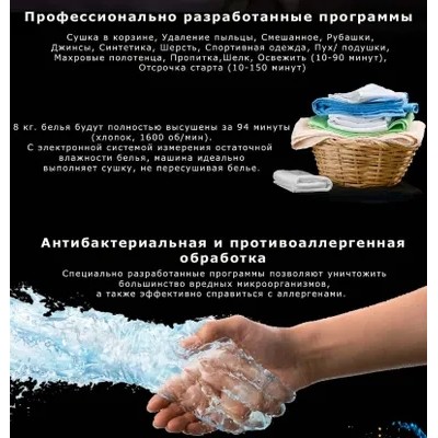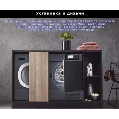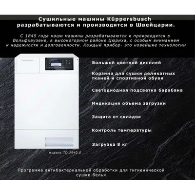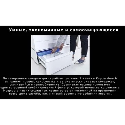 Dryer Kuppersbusch T 40.0 G Solid Gold Programs/additional programs: Automatic programs for cotton and wrinkle-resistant fabrics From iron dry to extra dry Special programs Basket dry, Pollen removal, Mixed, and other programs: Shirts, Jeans, Synthetics, Wool, Sportswear, Down/pillows, Terry towels, Impregnation, Silk, Refresh (10-90 minutes), Delay start (10-150 minutes) Favorites Stores up to 6 of your favorite programsAdditional functions Antibacterial treatment, Gentle care +, Drying +, Delay start, Express 8 kg of laundry will be completely dried in 96 minutes (“in the closet”) Advantages: Large 4.3'' color display Basket for drying delicate fabrics and sports shoes Condensation dryer with Heat Pump technology and Autoclean self-cleaning system for efficient use of energy throughout the entire service life of the machine Highest level of condensation efficiency Antibacterial treatment program for hygienic drying of laundry Pollen removal program allows you to clean pollen from fabrics Excellent sound insulation, max. 61 dB(A)LED drum lightingAnti-crease protectionElectronic system for measuring the residual moisture of the laundry Indication of the program progress and time until the end of the program, delayed start - up to 7 daysIntensity-adjustable acoustic signal of the end of the programHatch opening angle - 180°, hatch diameter - 36/31 cm Possibility of reversing the hatch (right/left) Child lock Temperature control Special programs Basket drying It is advisable to expose wet wool items as little as possible, as they tend to wrinkle and shrink. Sports shoes can damage the drum due to their weight. Using the basket allows you to perform gentle drying without moving individual machine washable items: woolen items, sports shoes made of synthetic materials or artificial leather, hats, bicycle helmets, stuffed animals, toys, etc. Mixed This program is ideal for drying a mixed batch of cotton laundry. and synthetics Other programs Use these programs for optimal drying of various types of textiles, such as shirts, blouses, jeans, wool, etc. Additional programs Antibacterial treatment Selecting this program increases the additional drying time, which allows you to destroy most bacteria Gentle Care Plus For gentle drying of delicate items. Drying temperature reduced Delayed start Using this program, you can delay the start of the program to a later time in accordance with your usual lifestyle (for example, to take advantage of a preferential night electricity tariff) Drying + When you select this program, the drying degree is temporarily increased - for the duration of the selected program Time When opening time-controlled programs displays the minimum program execution time Express For quick drying of small batches or individual items made of cotton, synthetics and