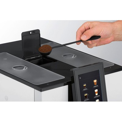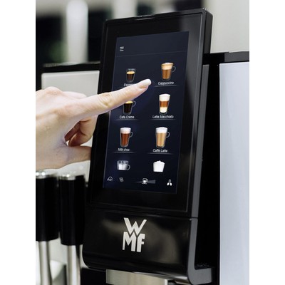 Color Touch DisplayThe intuitive design of the 7" color touch display with vertical swipe function makes navigation easy. You can customize the color scheme and button layout to suit your individual needs. Dual filling With the WMF 1100 S you have the ability to add two different fillings to your drink range, such as milk and chocolate - an option you're unlikely to find in other machines in its class .Professional brewerThe WMF 1100 S professional brewer is made of high-quality polymer for a long service life, is easy to remove and has a capacity of 15 g. Hot water dispenser A separate hot water spout allows you to easily prepare tea and other hot drinks at the touch of a button. Manual feed The practical manual dispenser allows you to use an additional type of ground coffee, for example decaffeinated coffee. Cup table The table for cups up to 100 mm high is built into the waste container. A separate drip tray makes the device easier to use and reduces the amount of cleaning required.