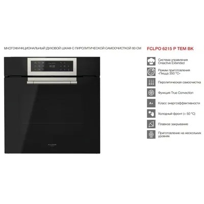Built-in oven with pyrolysis Fulgor Milano FCLPO 6215 P TEM BK- Touch control system Creactive Extended - Energy efficiency class: A + - Design: glass “Black obsidian”, steel handle EQUIPMENT: - “Pizza 350 °C” mode - 15 cooking functions ( maximum cooking temperature 290 °C) - Automatic cooking (pre-installed editable recipes) - BOOST fast heating mode - Pyrolytic self-cleaning function FEATURES: - Touch control panel - Cooking chamber with Ultra Black Piro ceramic enamel (nickel-free) - Dual lighting of the cooking chamber (2 halogen lamps) - Working chamber volume: 65 lSAFETY: - Four-layer glazed door - Smooth door closing - Automatic door locking during the self-cleaning cycle - Two-speed tangential cooling - Catalytic air purification system